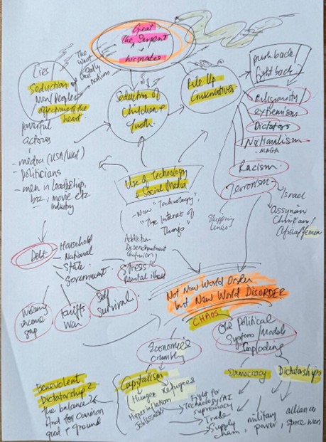在试图揭开这幅思维导图之前,我必须想首先声明,我不是专家;我只是一个与主同行,努力聆听和处理祂向我展示的东西的人。因此,如果对事实或事件的解释有任何错误,那完全是我的错。任何人都可以提出异议、批评或评论。我不会冒犯任何人,我祈祷你们也不会被冒犯。我将一切留在十字架上,只感谢上帝对所有人的慈爱和恩典。